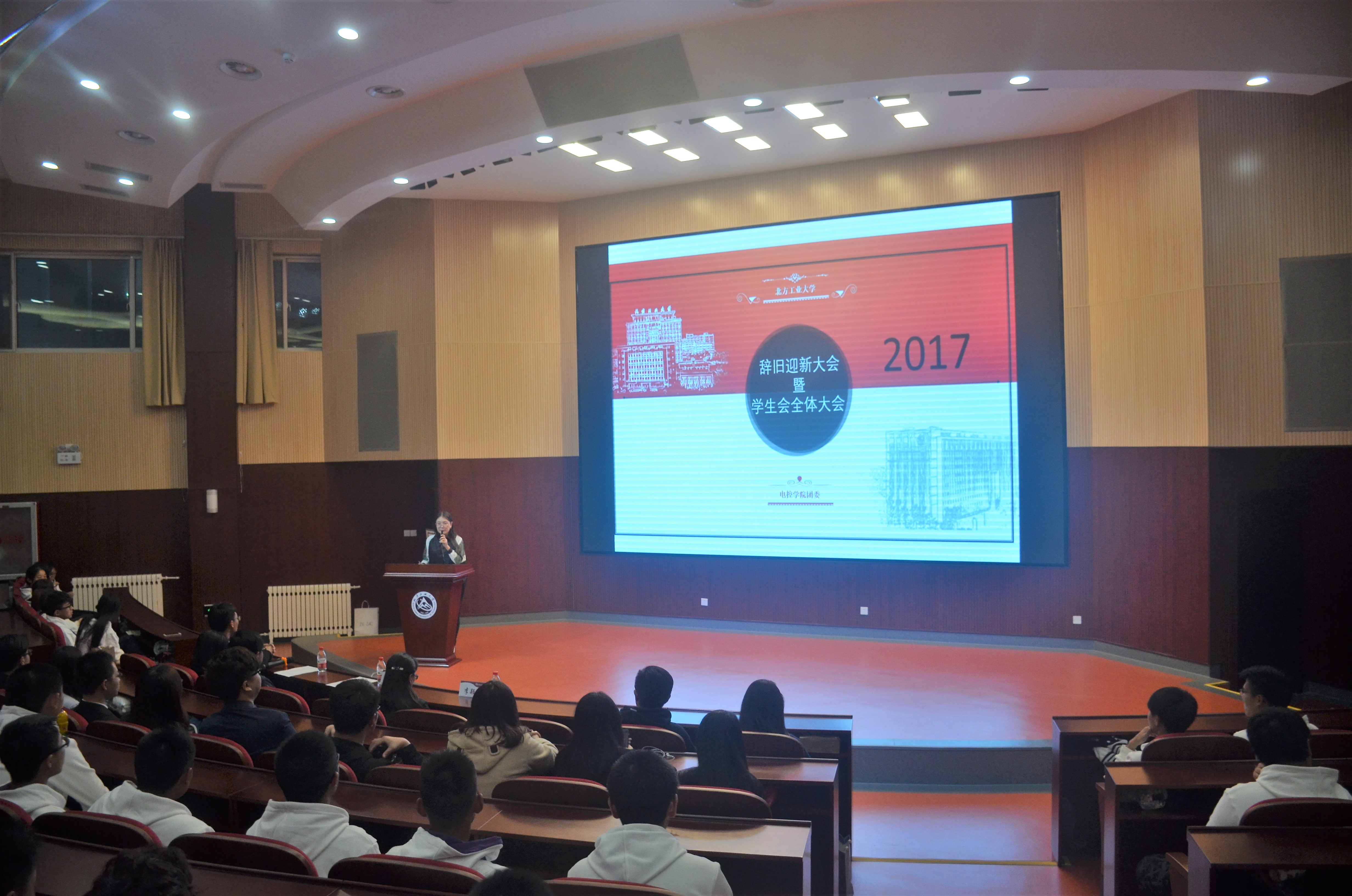 10月17日晚,2138CC太阳集团在文化会堂召开2017年团学辞旧迎新暨学生会全体大会。学院党委书记李颖宏、党委副书记史宁、辅导员库颖、王磊,上届团学干部代表及本届团学全体成员到场参加。